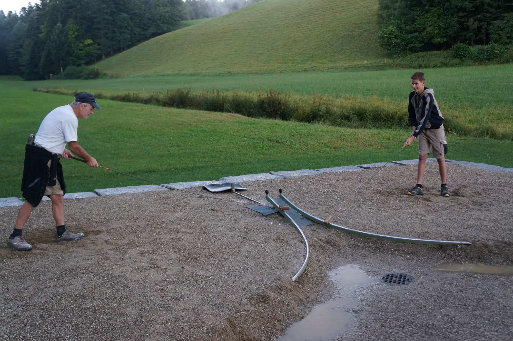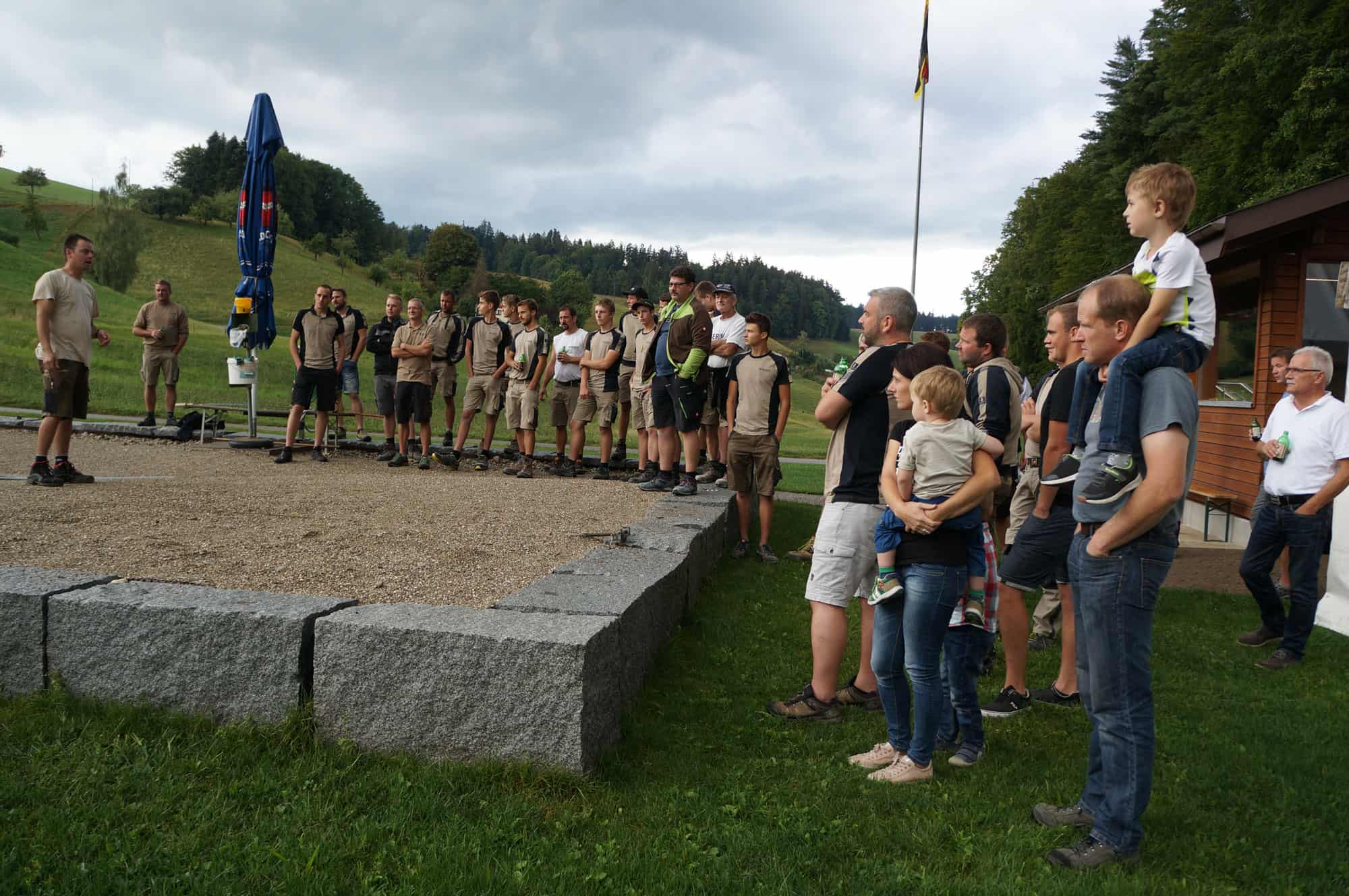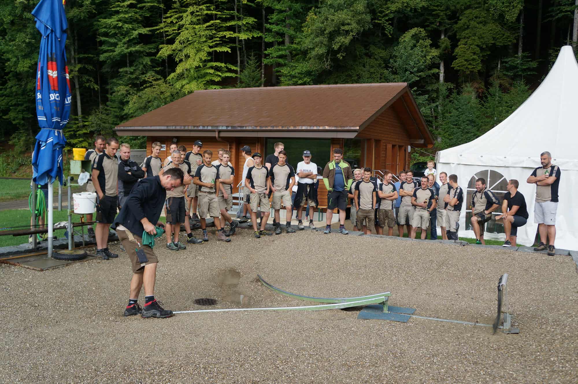 Am Dienstag, 14. August 18 hiess es, Hammer und Akku-Bohrer gegen die Nouss zu tauschen. Mitarbeiter Hans Spichiger, selber aktives Mitglied der Hornussergesellschaft Rohrbachgraben, führte seine Arbeitskollegen in Regeln und Technik des Hornussens ein. Sogleich begann die Übungsphase für die Zimmerleute. Mit viel Fleiss und Konzentration versuchte man die Nouss in die Luft zu befördern. Einige lustige Abschläge sorgten für Unterhaltung, doch bereits waren zielsichere Treffer zu sehen. Zufall oder Können? Beim anschliessenden Bräteln mit Partner/Partnerin, Kind und Kegel wurde rege diskutiert. Es war ein fröhlicher und gemütlicher Abend.