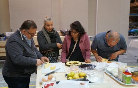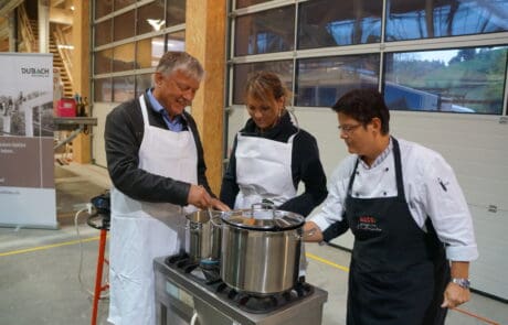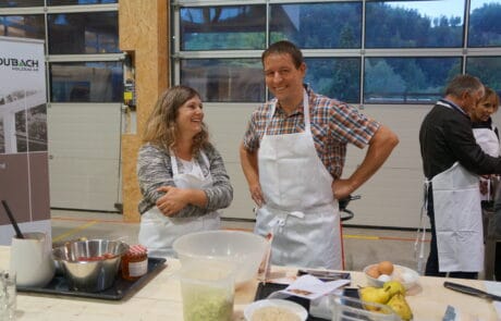 In unserer Werkhalle entstanden Anfang Oktober die Elemente zu den neuen Anbauten des Wohn- und Begegnungszentrums Violino Zell. Kombiniert mit dem 100-jährigen Jubiläum unserer Firma Grund genug, die Zeller Gemeinderäte zu einem entspannten Besuch vor Ort einzuladen. Anschaulich präsentierten die Mitarbeitenden, wie die Gebäudeteile im Büro geplant und in der Halle an verschiedenen Stationen massgenau vorgefertigt werden. Für alle ein toller Einblick in den Bauprozess und eine nachhaltige Erinnerung, wenn danach die fertigen Gebäude in Zell aufgebaut werden. Nach dem informativen Teil war es an den Gemeinderäten und ihrer Begleitung, sich die anschliessende Verpflegung zu verdienen. Ebenfalls an verschiedenen Stationen wurde in kleinen Gruppen unter fachkundiger Anleitung der Köchin das Nachtessen zubereitet. Ein erlebnisreicher Ausflug für den Gemeinderat – und abwechslungsreiche Stunden für das Dubach-Team!