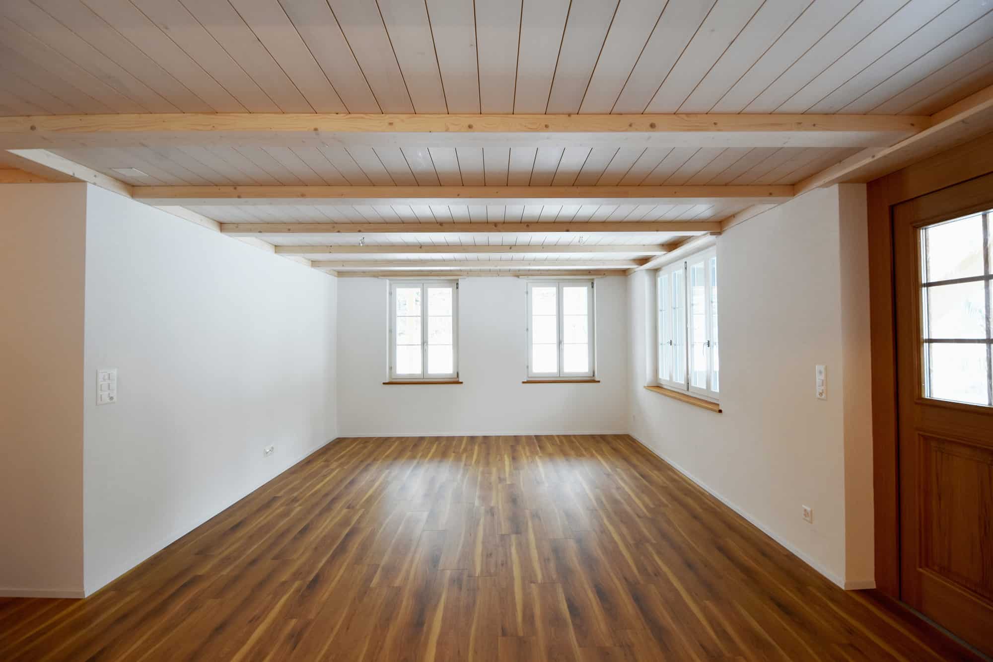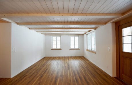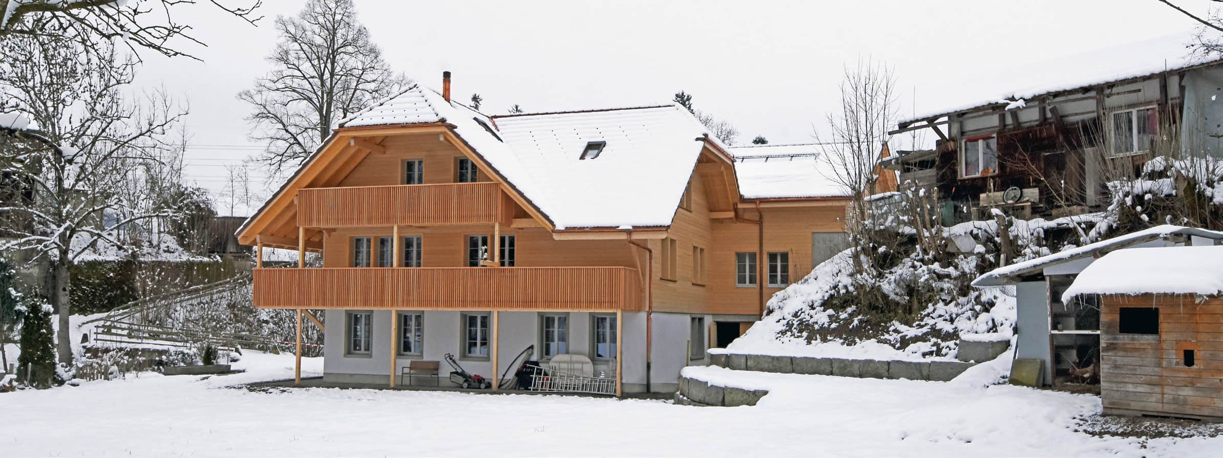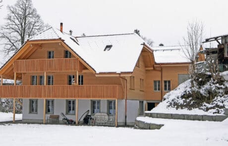 Nach einem Brand wurde dieses landwirtschaftliche Gebäude wesensgleich wiederaufgebaut. Die Architektur widerspiegelt die ehemaligen Stallungen – das Erdgeschoss ist als Mauerwerk ausgeführt, im Obergeschoss aus Holz befindet sich eine Klackwand, die mit einer Glasfront nach innen abschliesst. Dies schafft ein einzigartiges Ambiente für die dahinter liegenden Wohnräume. Unsere Holz-/Beton-Verbunddecken bieten dazu optimalen Schall- und Brandschutz für die drei Wohneinheiten. Besichtigen Sie das attraktive Gebäude am Tag der offenen Tür vom Samstag, 26. Januar 2019, von 10-15 Uhr.