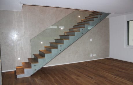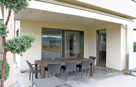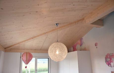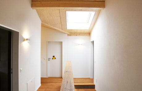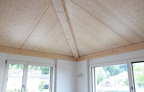 Das spezielle Walmdach mit verschiedenen Dachneigungen wurde in grossformatigen Dachelementen gefertigt und auf einen vom Baumeister erstellten Unterbau montiert. Wichtig dabei war eine übergreifende Kommunikation zwischen Planer, Baumeister und Holzbauer. Entstanden ist bei diesem Projekt eine sehr schöne Lösung und passende optische Detailanschlüsse.