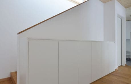 Dieses schöne Wohnhaus in Ufhusen ist mit einer unterhaltsarmen, vorvergrauten vertikalen Holzfassade verkleidet. Es wirkt dadurch gegen aussen gradlinig und schlicht. Die hellen Innenräume trumpfen auf mit Geschossdeckenelementen, die mit einer Akustikprofilierung einerseits eine schöne Decke bilden und andererseits für angenehm ruhige Bedingungen in den Wohnräumen sorgen. Die Parkettbodenbeläge in den Wohnräumen sind über die Treppe im gleichen Material gezogen und geben so eine edle und pflegeleichte Oberfläche.