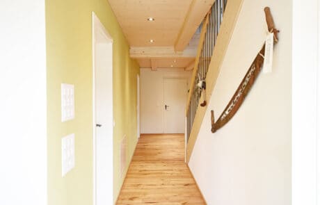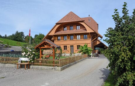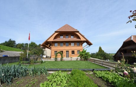 Die gestrichene Holzfassade mit der für Berner Bauernhäuser typischen Ründe leuchtete stolz in der Sommersonne. Wo vorher ein altes Bauernhaus mit niederen Decken und dunklen Räumen war, steht heute ein modernes Holzhaus, das sich wieder optimal in die landwirtschaftliche Umgebung einfügt. Das Haus beweist, dass das Bestehende auf moderne Weise interpretiert werden kann, auch wenn ein Ersatzbau die optimale Lösung für die Modernisierung ist.