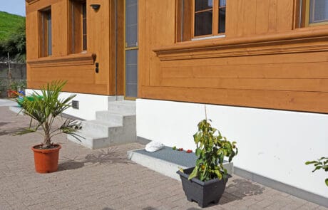 | Fassade | Holzfassade hinterlüftet, mit profilierten Geschossringbänder und Fensterbänke |