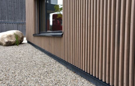 | Fassade | Fichtenstäbe strukturfein gehobelt, gestrichen mit hinterlegten Fassadenbahnen |