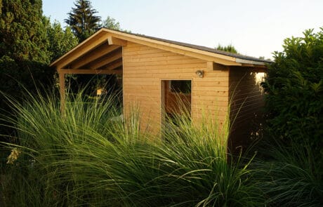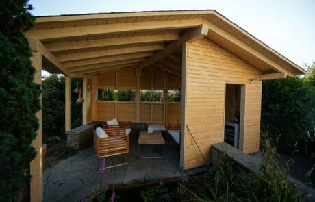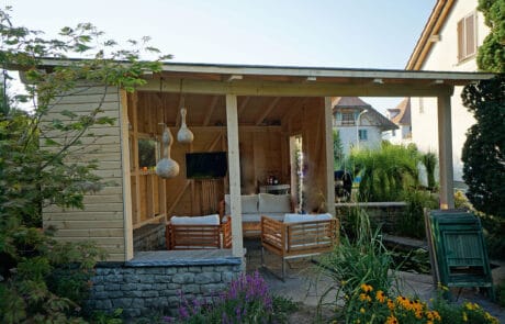 Um die lauen Sommerabende draussen geniessen zu können, wurde das Gartenhaus erstellt. Es bietet Schutz vor Sonne und Regen und zeichnet sich durch seine Schlichtheit aus. Der Terrassenrost ist ein schönes Element, welches sich optimal an das Haus anpasst und den Wohnraum vergrössert. Der Höhenunterschied von der ersten Etage zum Garten wurde gekonnt angepasst und angeglichen.