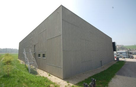 Das kubische Hochregallager der Mathys AG umfasst eine Kapazität von 4‘000 Europaletten-Plätzen. Die Logistikhalle besticht durch eine sehr schöne Ästhetik. Die 14 Meter hohe Fassade ist mit vertikalen Massivholzschalungen ausgeführt. Die Hölzer dafür vorvergraut. Daraus resultiert eine gleichmässige Alterung und eine unterhaltsfreie Fassade. Die ressourcenschonende Bauweise der neuen Gebäude erlaubt der Logistik- und Transportunternehmung eine neue Positionierung gegenüber den Kunden.