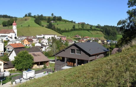 In Luthern steht ein neues Holzhaus, das – salopp gesagt – architektonisch von einer Scheune abgeleitet wurde. Die dunkle Fassade ist mit einer Schwedenfarbe gestrichen; eine moderne Schlammfarbe, die für hohe Ökologie und wenig Unterhalt steht. Die Kombination mit dem Kupferblech bei den Geschossringbändern gibt dem Einfamilienhaus eine anziehende Ästhetik.