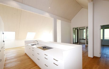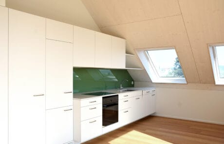 Der mehrgeschossige Massivbau Mühlihof ist ein Element der Kulturlandschaft Kastelen in Alberswil. Er beinhaltet mehrere Wohnungen und ein Aparthotel. Während die unteren Geschosse aus Beton sind, sind die Dachelemente im Holzsystembau ausgeführt. Die grossflächigen Elemente wurden in Hüswil vorgefertigt und mit fertig eingebauten Dachfenstern auf die Baustelle geliefert und montiert. Die Qualität und Behaglichkeit des natürlichen Baustoffs macht sich im obersten Geschoss wohlig bemerkbar.