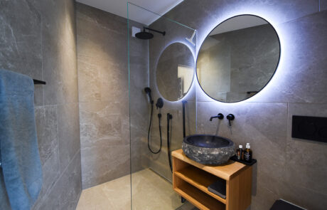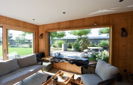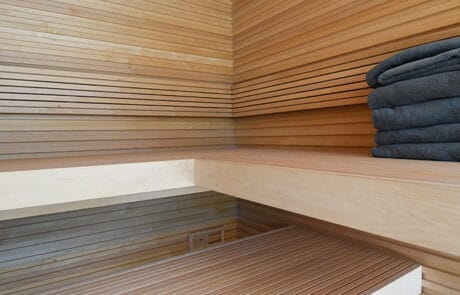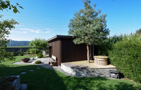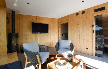 Das Saunahaus beeindruckt mit einem lichtdurchfluteten Aufenthaltsraum – dank Panoramafenster auf der Südseite und dem Zugang durch ein Hebeschiebefenster. Ein besonders rustikaler Charme entsteht durch die innere Verkleidung mit Altholz, dem Eichen-Blockfutter als Sitzgelegenheit beim Panoramafenster und der Akustik-Deckenverkleidung. Ein weiteres Stilelement stellt der schräge Wandteil im viereckigen Grundriss dar.