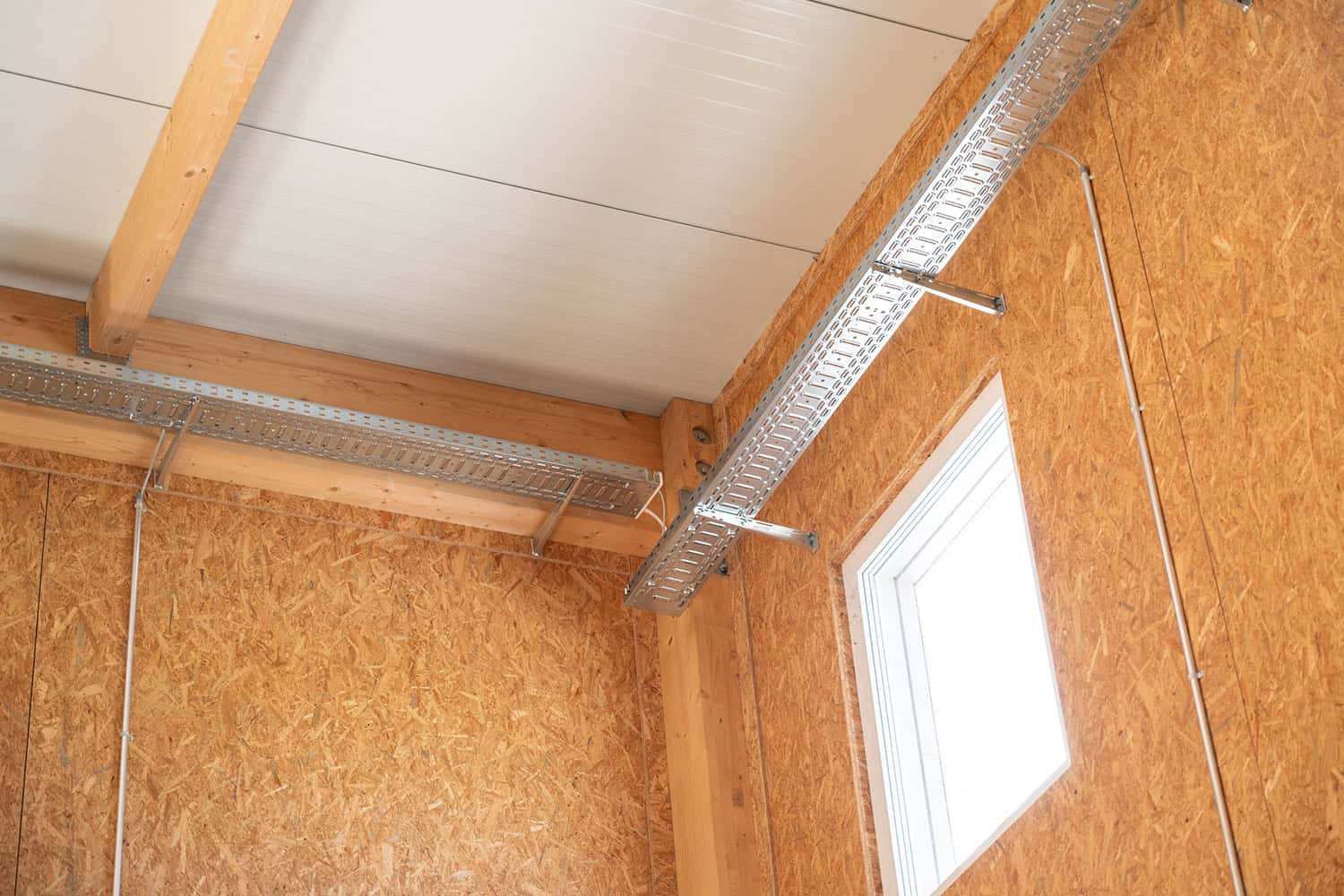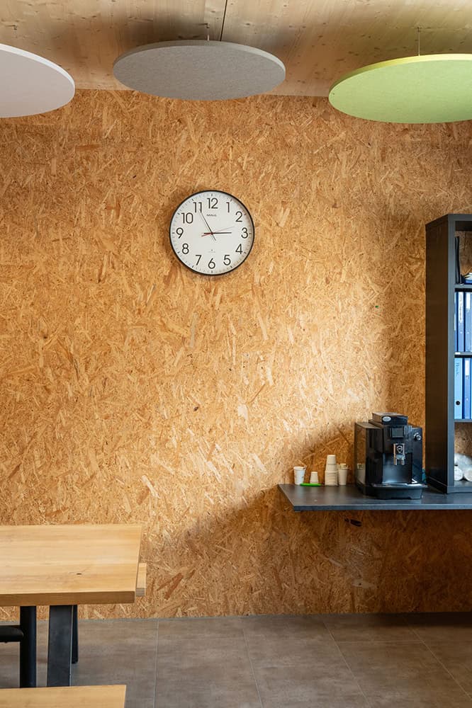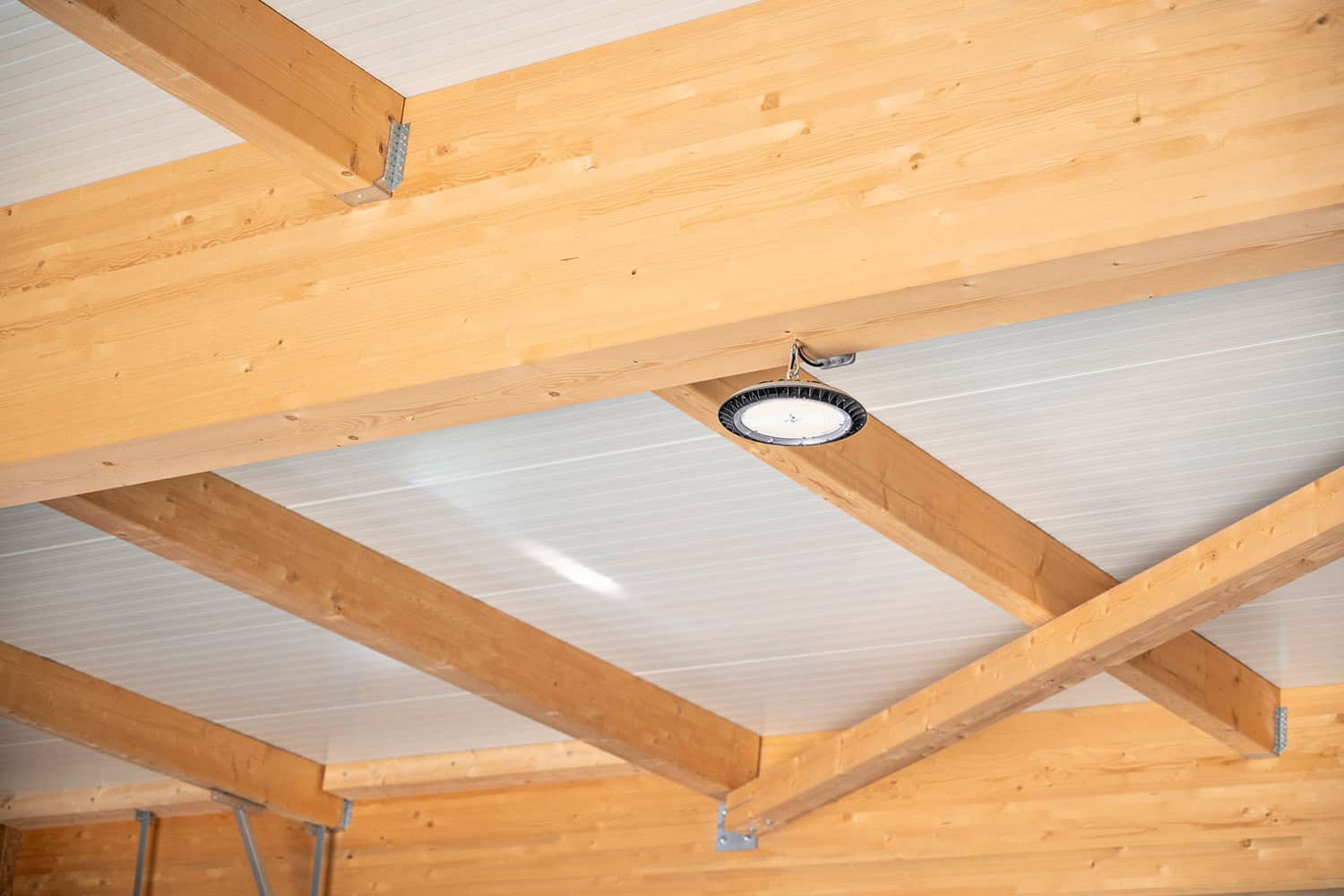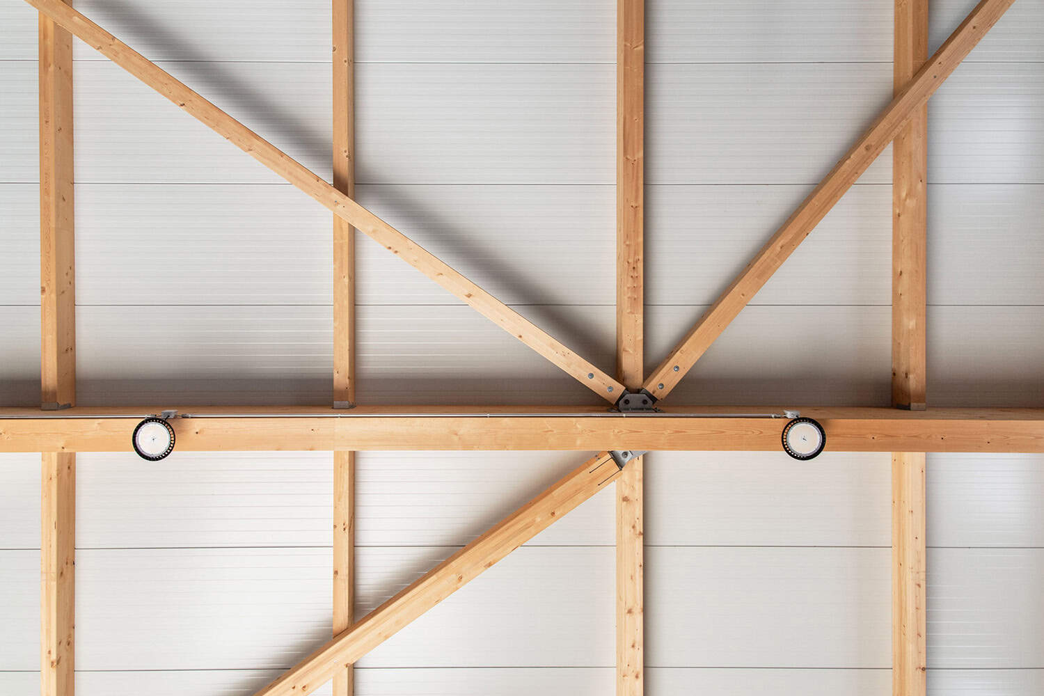 Kopfbau und Halle wurden mehrheitlich in Holzbauweise realisiert. Die Geschossdecken entstanden im HBV-System – eine tragfähige Lösung mit Vorteilen im Brand- und Schallschutz. Weil der Bauherrschaft ein ausgeglichenes Innenraumklima wichtig war, entschied sie sich auch bei der Werkhalle bewusst für einen Holzbau. Dieser Anspruch zeigt sich ebenso im Innenausbau: In den ersten beiden Geschossen wurden Wände und Decken durchgehend mit Dreischichtplatten verkleidet, was ein ruhiges und natürliches Raumgefühl schafft.