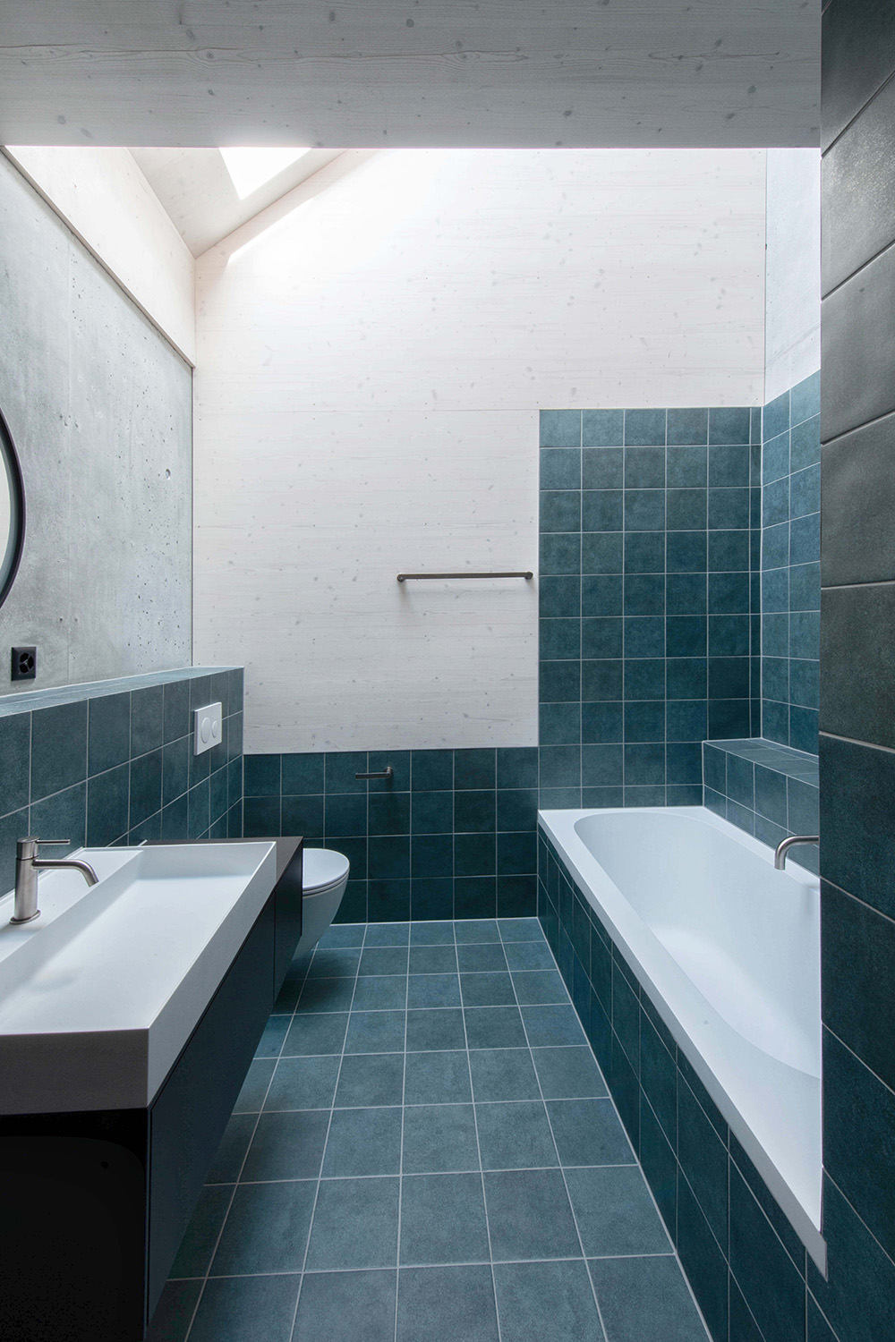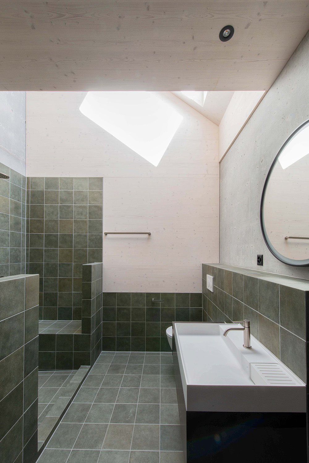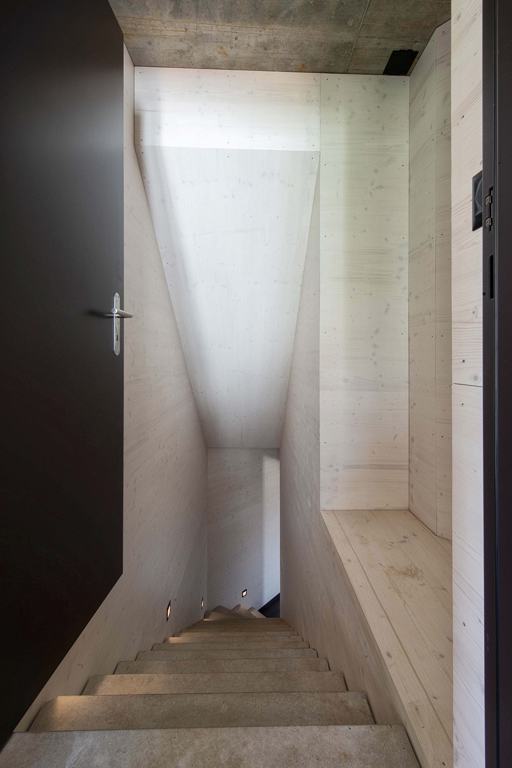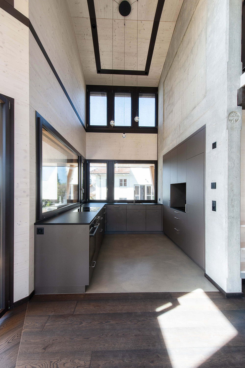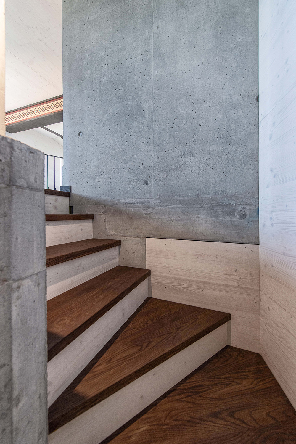 Der Bauherrschaft war wichtig, dass Materialien in ihrer ursprünglichen Form wirken. Sichtbeton und Holz prägen deshalb das Innenleben und es wurde bewusst auf verputzte oder gestrichene Oberflächen verzichtet. So entsteht ein unmittelbarer, ehrlicher Ausdruck, der die gewählten Materialien in den Vordergrund stellt.