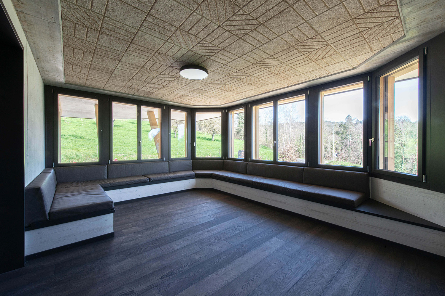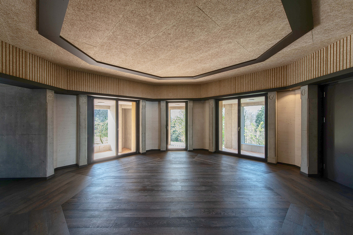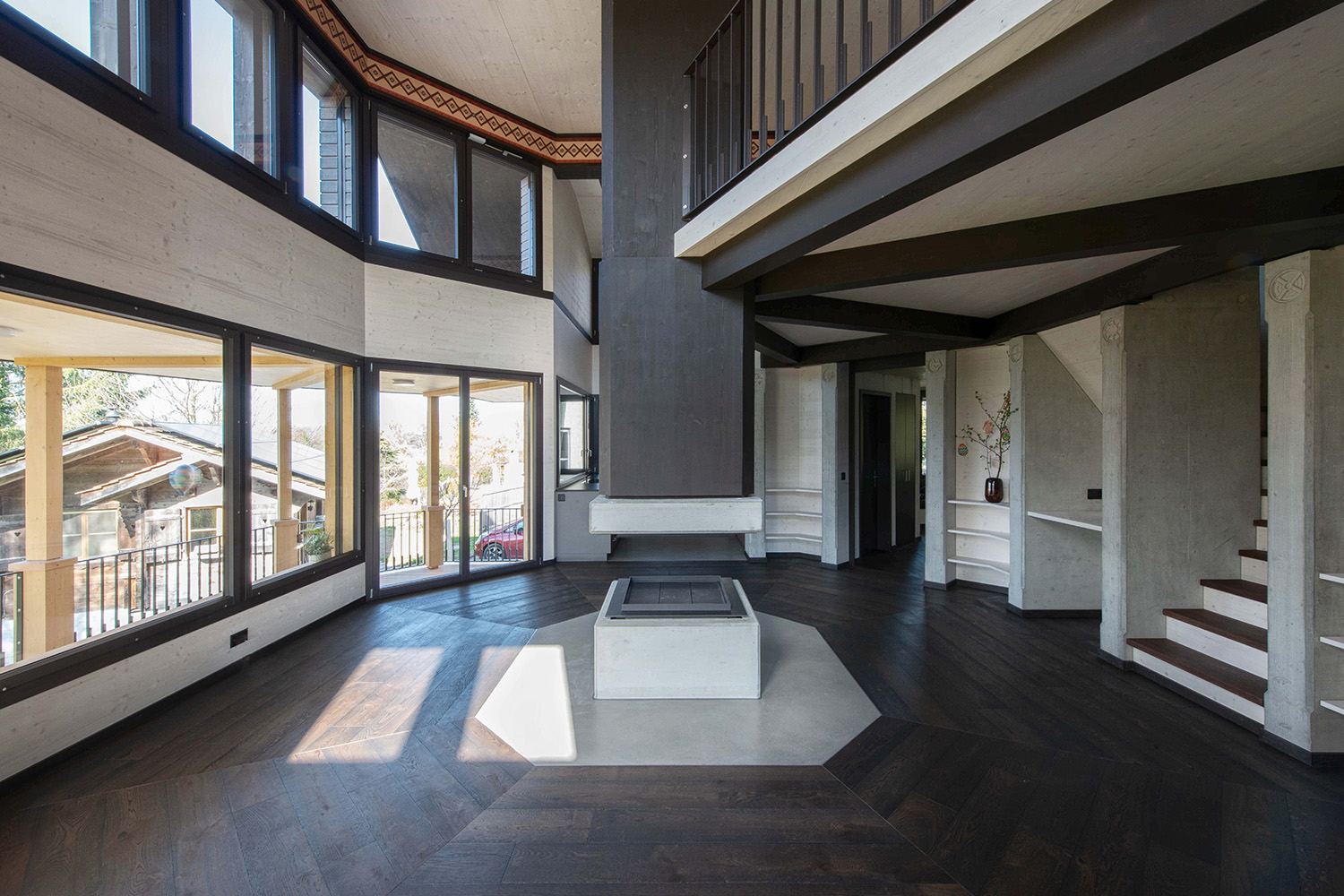 Ein zentrales Element bildet der offene Kursraum mit einer markanten Balkenstruktur in Form eines Thunderbirds – ein räumlicher Mittelpunkt mit starker gestalterischer Aussage. Im Wohnbereich setzt ein freihängendes Cheminée einen klaren Akzent, während Akustikdecken aus Holzwollplatten mit gefrästen Strukturen die Räume ergänzen.