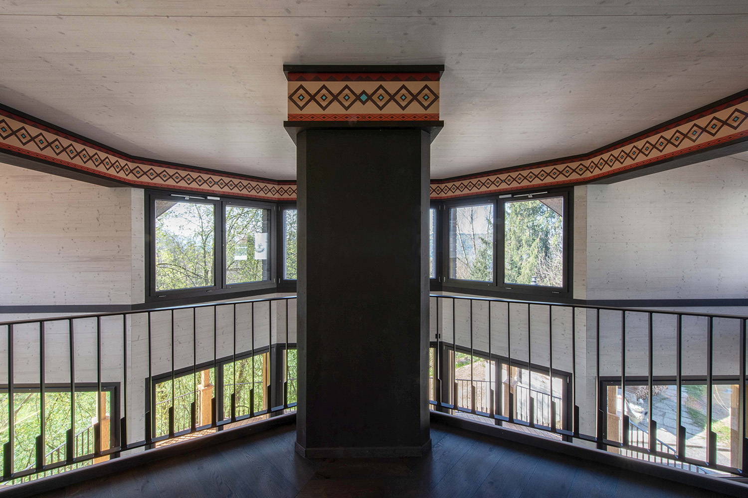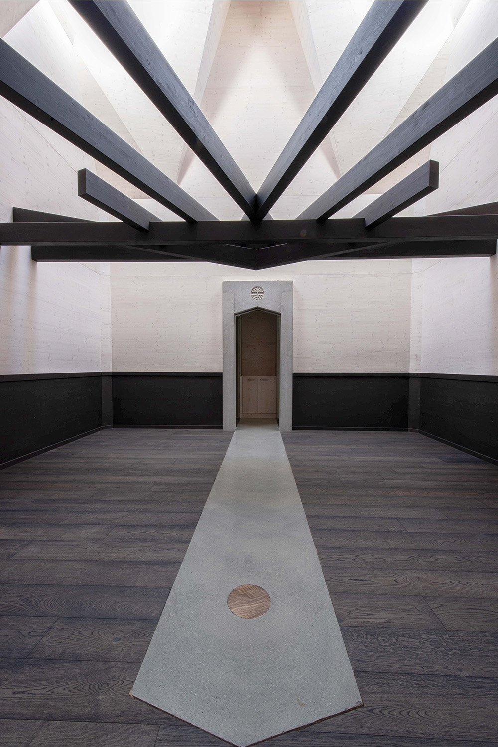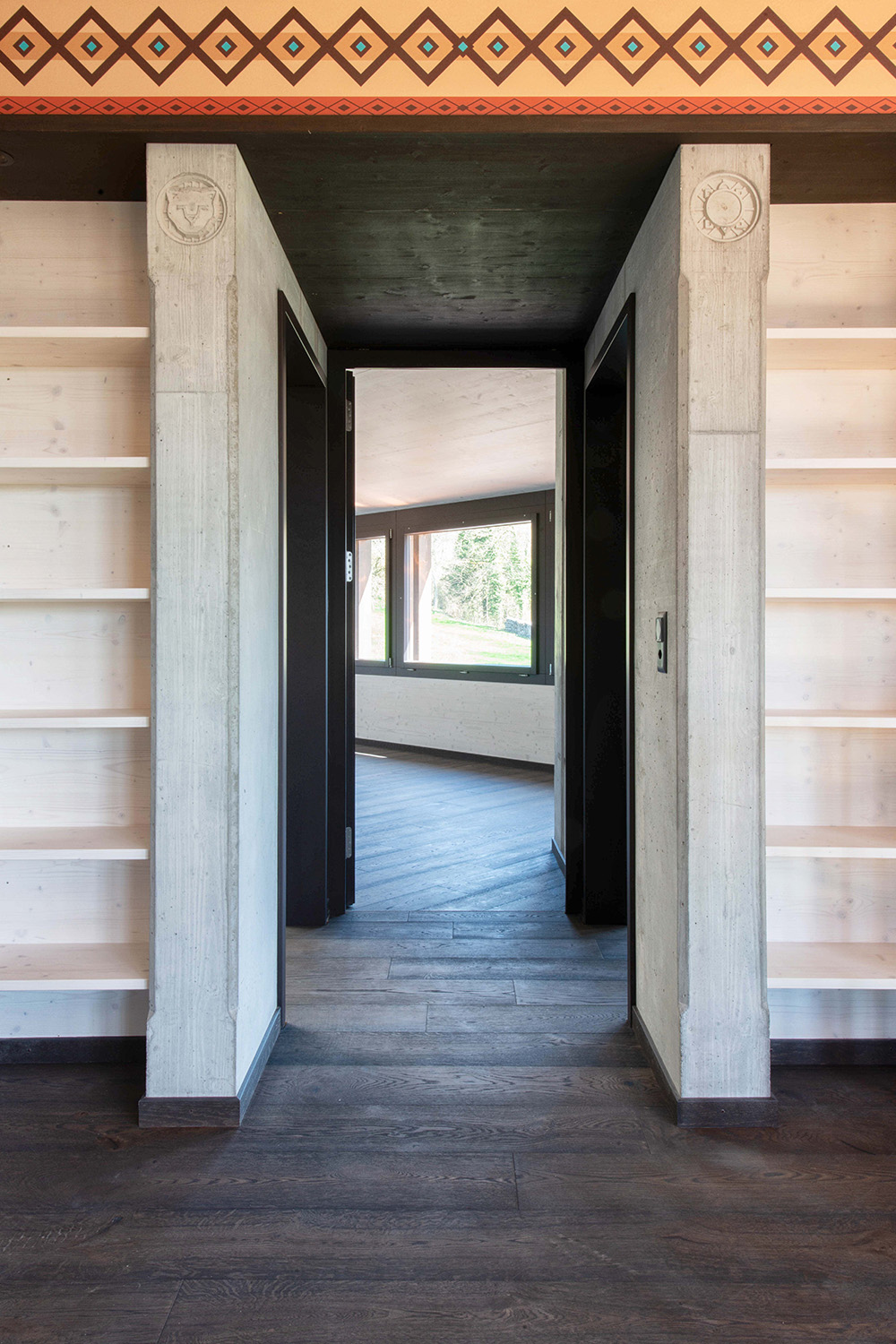 Ein zentrales Element bildet der offene Kursraum mit einer markanten Balkenstruktur in Form eines Thunderbirds – ein räumlicher Mittelpunkt mit starker gestalterischer Aussage. Im Wohnbereich setzt ein freihängendes Cheminée einen klaren Akzent, während Akustikdecken aus Holzwollplatten mit gefrästen Strukturen die Räume ergänzen.