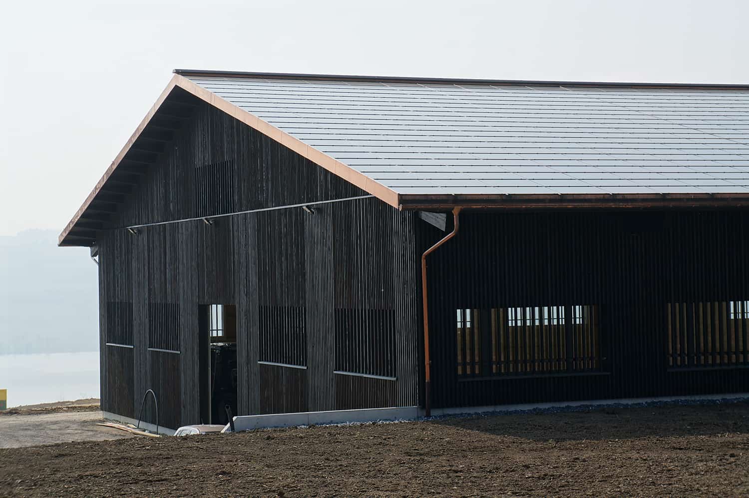 Der grossvolumige Bau erscheint in einem für Landwirtschaftsgebäude ungewohnten Erscheinungsbild. Die klaren Linien werden durch die lamellenartige Fassade und die über die Fenster gezogenen Lamellen unterstützt. Die Dachflächen sind mit Photovoltaik-Dachelementen eingedeckt und liefern Strom für ca. 60 Haushalte. Das Gebäude ist ausgezeichnet mit dem Zertifikat Schweizer Holz. Durch die verbaute Holzmasse speichert das Gebäude x-Tonnen Co2 und ist mit einem Zertifikat des Co2-Institutes dafür gewürdigt.