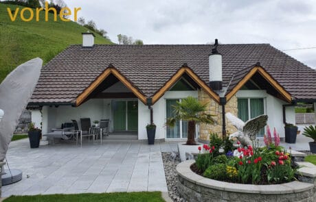 Das gesamte Dach ist energetisch neu aufgebaut worden und zugleich einige Teile der Fassade. Nicht nur sieht man optisch einen grossen Unterschied, sondern zeigen sich die Vorteile vor allem im gesunkenen Energieverbrauch. Speziell ist bei diesem Dach, dass dieses im Jahre 1983 bereits von unseren langjährigen Mitarbeitenden Erwin und Adolf aufgerichtet wurde – die beiden sind bis heute Teil unseres Teams.