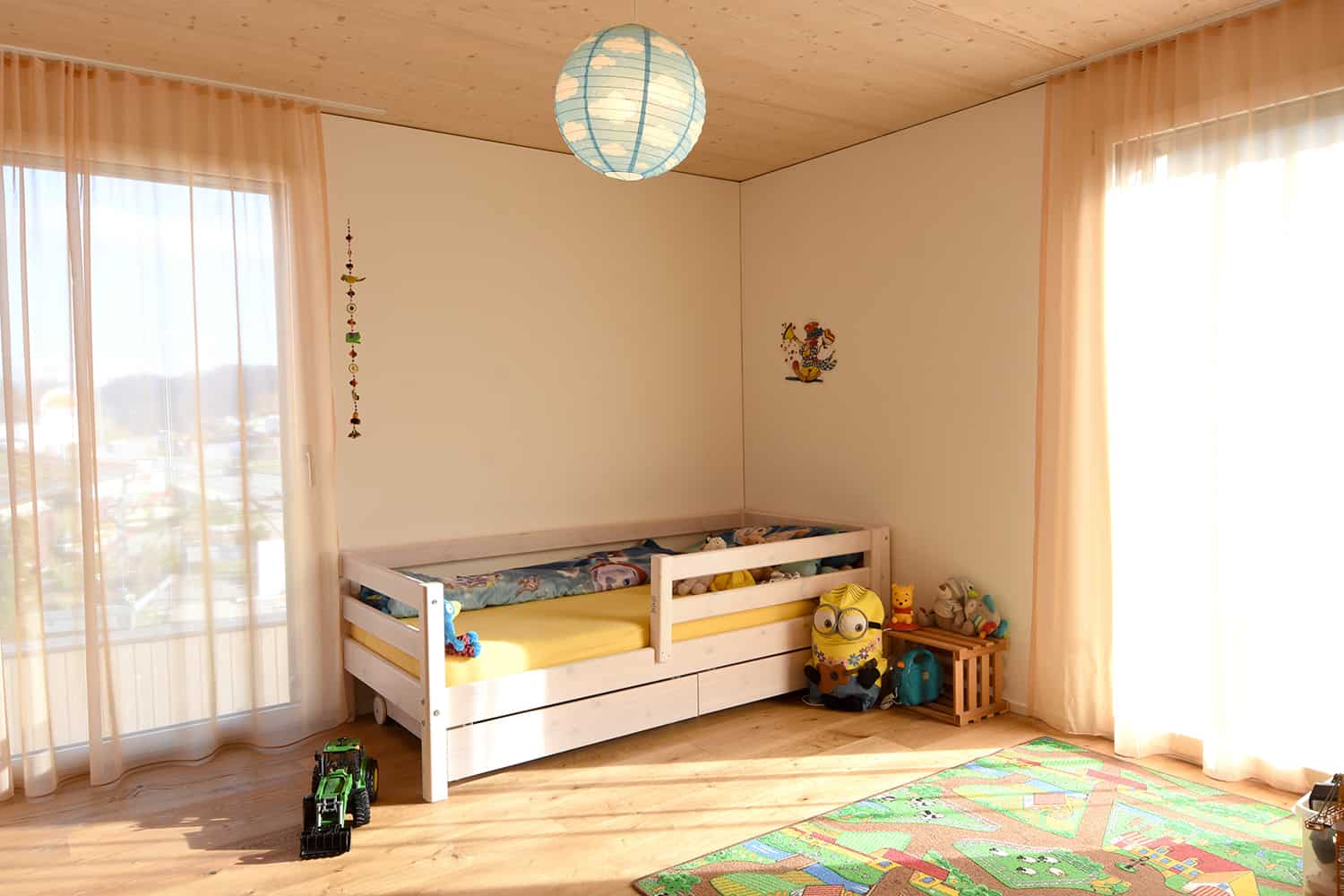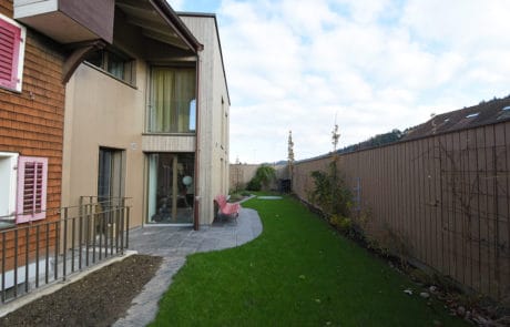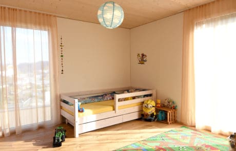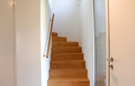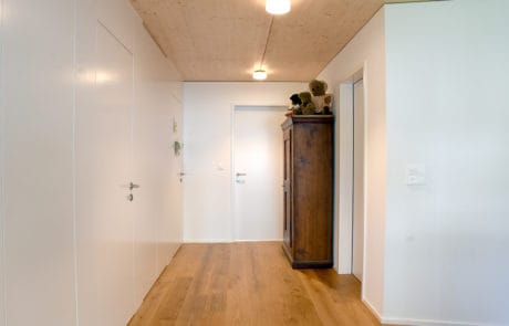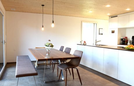 Dieser Um-/Anbau entstand ab der Bodenplatte komplett in Elementbauweise. Die Holz-/Betonverbunddecke erlaubte es, trotz geringer Deckenhöhe eine integrierte Wohnungslüftung zu realisieren. Die hell gestalteten Räume bringen viel Licht ins Haus. Ein angenehmes Wohnklima für die Bewohner ist garantiert!