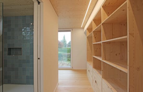 | Fassade | Vertikale Holzfassade mit unterschiedlichen Lamellenbreiten, druckimprägniert und gestrichen Fensterfutter und Giebelwand aus heimischer Lärche, unbehandelt |