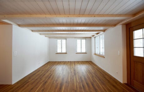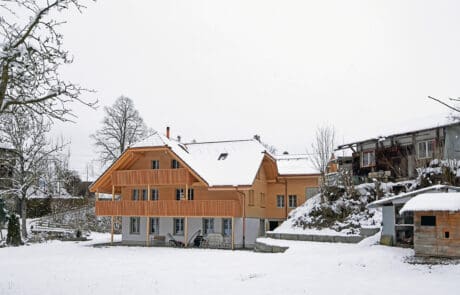 Nach einem Brand wurde dieses landwirtschaftliche Gebäude wesensgleich wiederaufgebaut. Die Architektur widerspiegelt die ehemaligen Stallungen – das Erdgeschoss ist als Mauerwerk ausgeführt, im Obergeschoss aus Holz befindet sich eine Klackwand, die mit einer Glasfront nach innen abschliesst. Dies schafft ein einzigartiges Ambiente für die dahinter liegenden Wohnräume. Unsere Holz-/Beton-Verbunddecken bieten dazu optimalen Schall- und Brandschutz