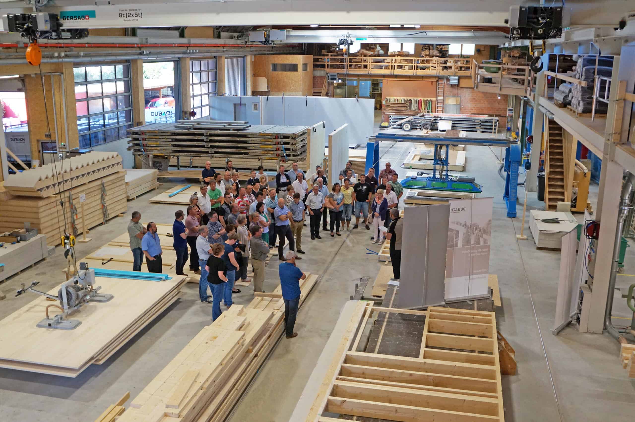 Nach kurzer Begrüssung lud Geschäftsführer Stefan Dubach zur Führung durch den – auffallend ordentlichen – Betrieb, der dieses Jahr sein 100-jähriges Jubiläum feiert. In kurzweiligen anderthalb Stunden erläuterten Mitarbeitende den aufmerksamen Zuhörern an verschiedenen Posten den Produktionsprozess bei Dubach. Vom Lernenden bis zum Projektleiter – stolz brachten die Experten den Gästen näher, wie ein Holzhaus im Büro geplant wird in der Werkhalle entsteht. In der notabene neuen Werkhalle, welche erst vor wenigen Monaten eingeweiht wurde. Sichtlich beeindruckt trafen sich die Gewerblerinnen und Gewerbler anschliessend zum Apéro, um sich über das eben Gesehene, über aktuelle Geschäftsgänge und künftige Pläne auszutauschen. Dass am Ende der Metzger Stöckli Grill und Fleisch und der Bäcker Wagner Brot und Dessert für ein spontanes Znacht organisierten, spricht sehr für die Qualität und Geselligkeit des Anlasses.